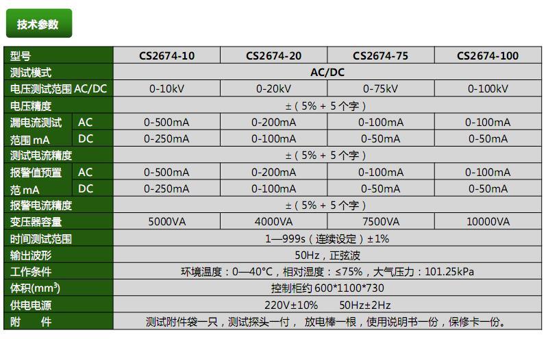 CS2674系列超高压耐压测试仪是在吸收、消化国际先进绝缘耐压测试仪的基础上,结合我国众多用户的实际使用情况加以提高、完善而研制。在结构上采用了分体方式,将操作员远离高压测试区,确保操作员的人身安全。 超高压耐压测试仪适用于各种家用电器、电源、高压电缆线、变压器、电机、高压接线端子、高低压电器、开关、航空航天的高压材料分析等的强电系统的安全耐压和漏电流测试。同时也是科研实验室、技术监督部门不可少的超高压源试验设备。 超高压耐压测试仪同时也是各电力机车、地铁、轻轨必备的检验设备。100kV超高压仪已作为中国南车集团戚墅堰机车车辆厂、中国北车集团、铁道部产品质量监督检验中心机车车辆检验站的检验设备。同时也售往成都机车车辆厂、湖南电力机车厂、洛阳机车厂、株洲车辆厂、南京浦镇车辆厂等。