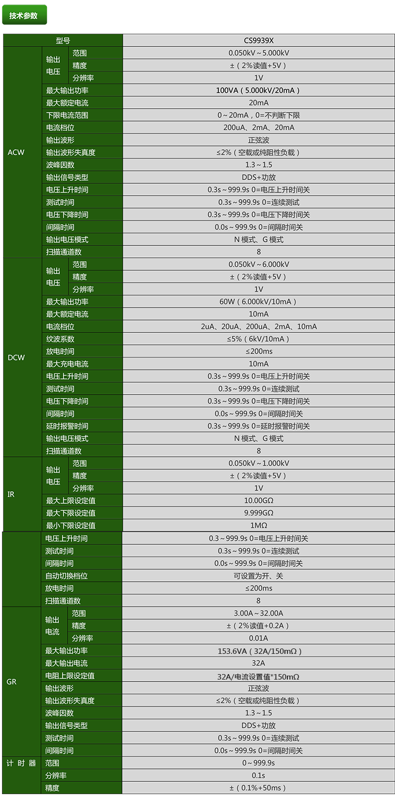 CS9939X程控多路绝缘耐压、接地电阻测试仪,ACW:5KV/20mA,8通道,DCW:6KV/10mA,8通道,IR:1KV/10G,8通道,GR:32A/150mΩ